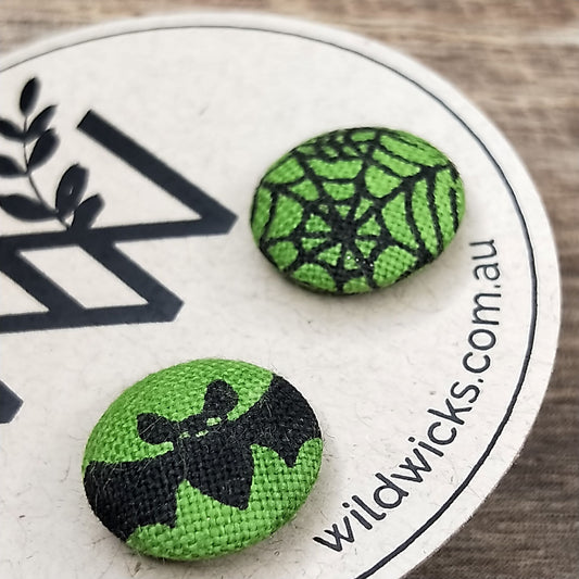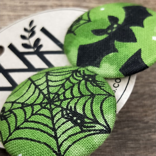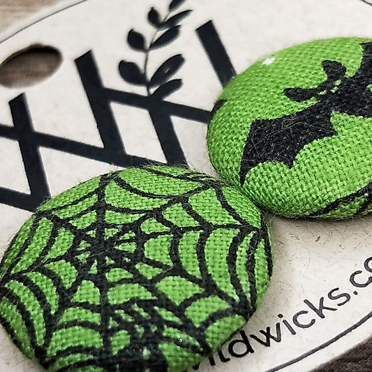 Wildears Fabric Covered Button Earrings Halloween Green Bats and Spiders 27mm