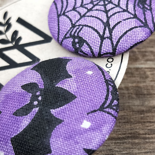 Wildears Fabric Covered Button Earrings Halloween Purple Bats and Spiders 27mm