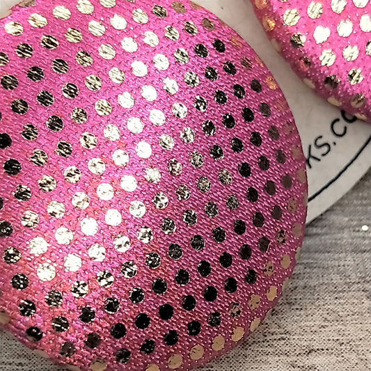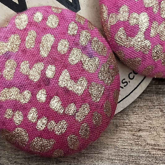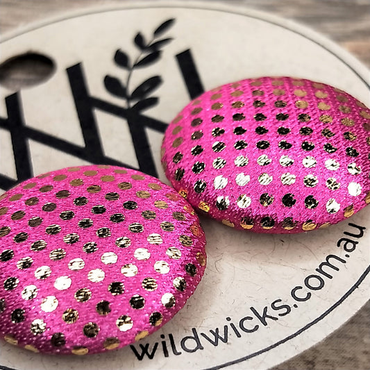 Wildears Fabric Covered Button Earrings Gold Spot Pink 27mm