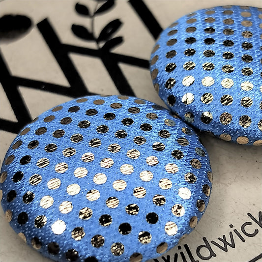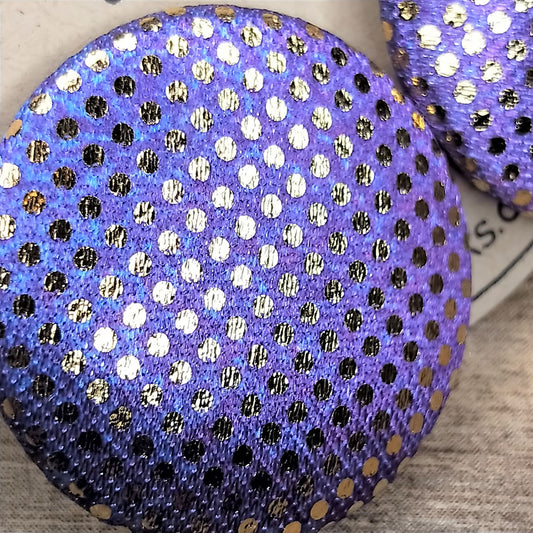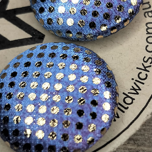 Wildears Fabric Covered Button Earrings Gold Spot Purple Blue 27mm