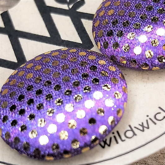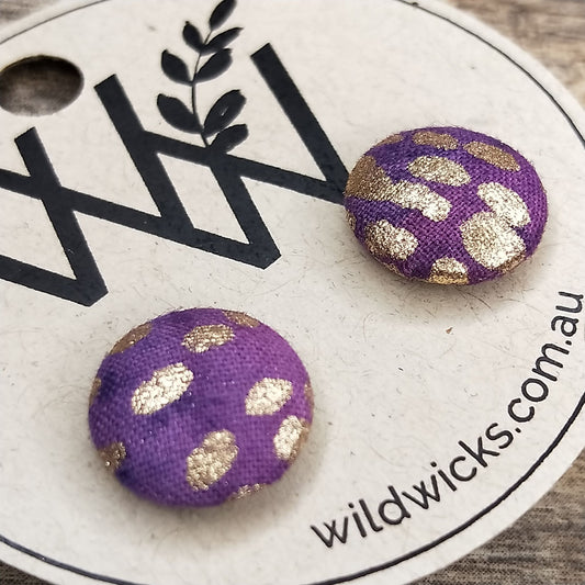 Wildears Fabric Covered Button Earrings Gold Spot Purple 19mm