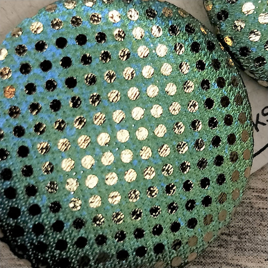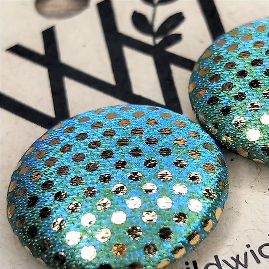 Wildears Fabric Covered Button Earrings Gold Spot Blue Green 27mm