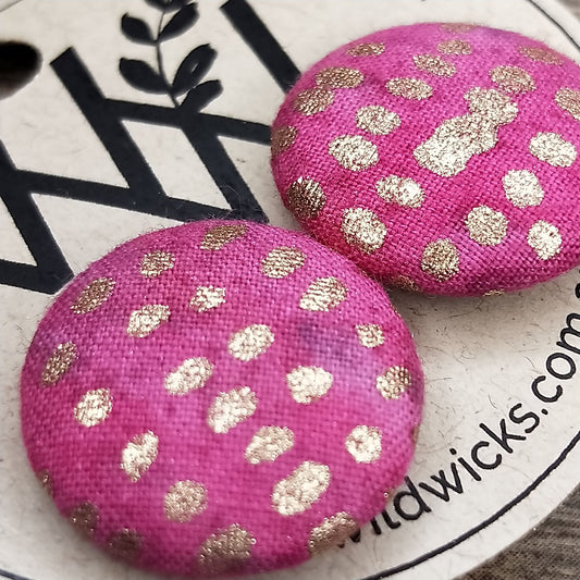 Wildears Fabric Covered Button Earrings Gold Spot Magenta 19mm