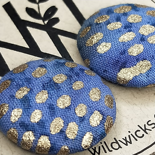 Wildears Fabric Covered Button Earrings Gold Spot Blue 19mm
