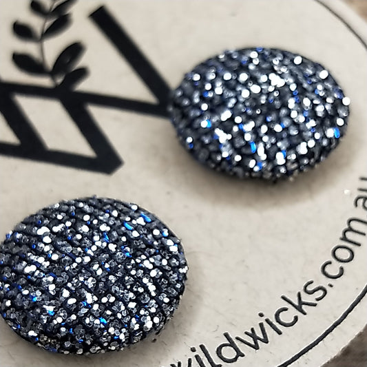 Wildears Fabric Covered Button Earrings Black Blue Silver 19mm