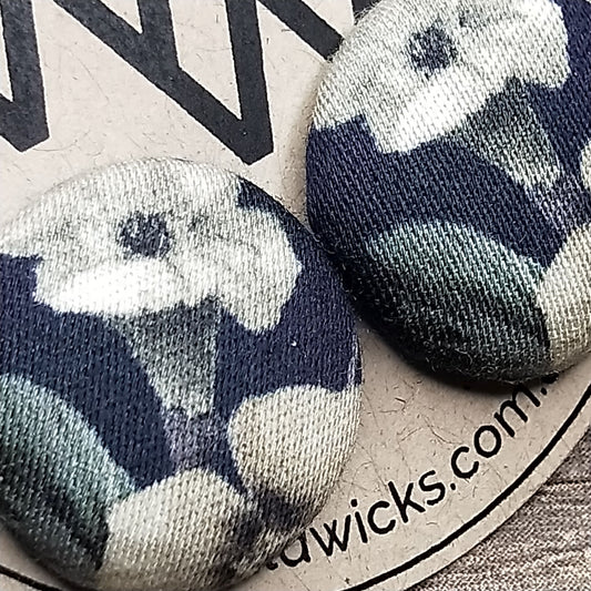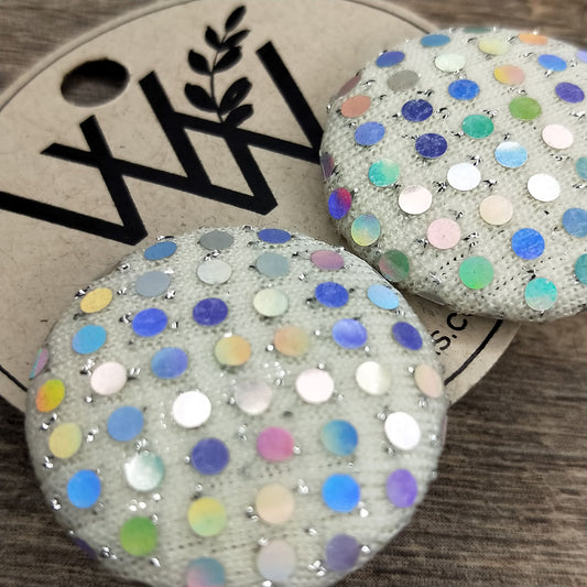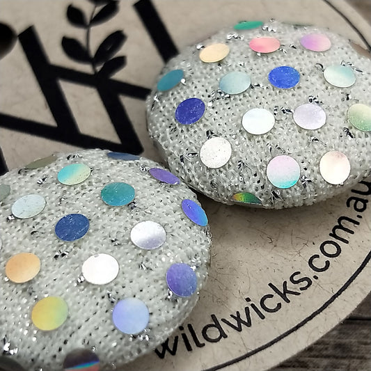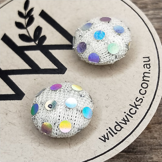 Wildears Fabric Covered Button Earrings White Holograph Dots 27mm
