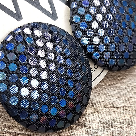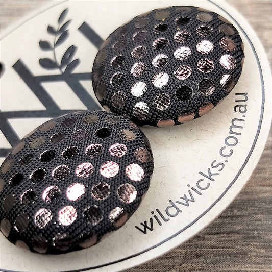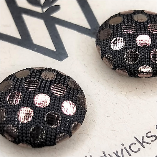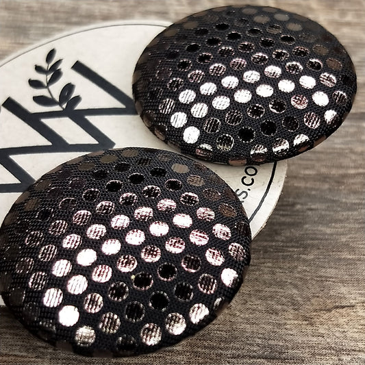 Wildears Fabric Covered Button Earrings Black Metallic Dots 27mm