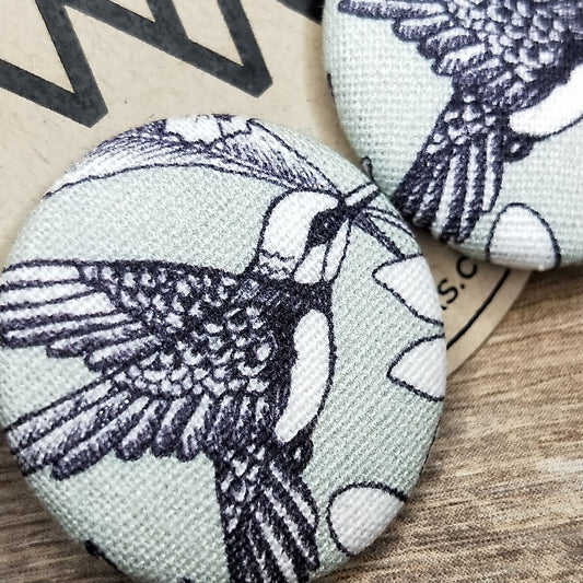 Wildears Fabric Covered Button Earrings Hummingbird 27mm