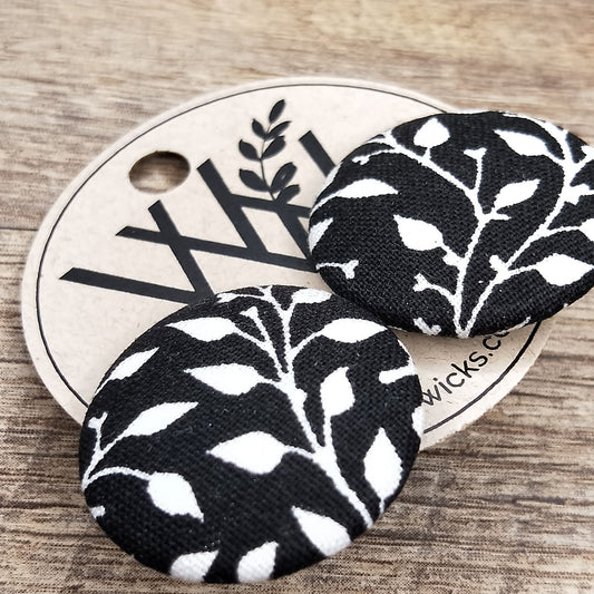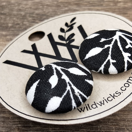 Wildears Fabric Covered Button Earrings Black and White Leaf 27mm