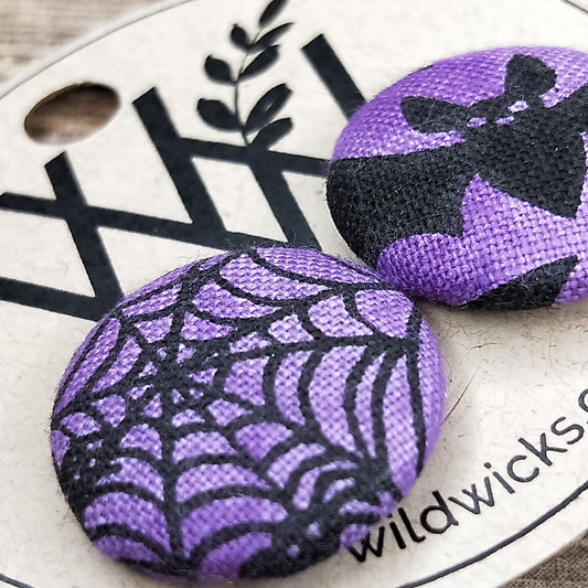 Wildears Fabric Covered Button Earrings Halloween Purple Bats and Spiders 19mm