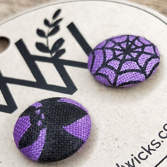 Wildears Fabric Covered Button Earrings Halloween Purple Bats and Spiders 12mm