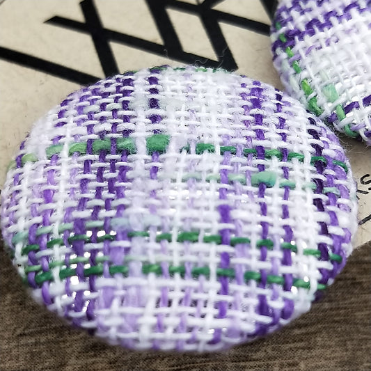 Wildears Fabric Covered Button Earrings Purple and Green Weave 27mm