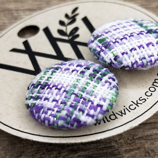 Wildears Fabric Covered Button Earrings Purple and Green Weave 19mm