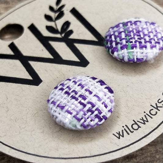 Wildears Fabric Covered Button Earrings Purple and Green Weave 12mm